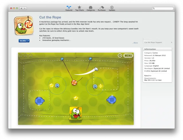 Har du lust att sabba produktiviteten totalt? Då kanske Mac-versionen av Cut the Rope, känt från just din iPhone, är något för dig. 38 kr på Mac App Store, 133 MB tungt och säkerligen livsfarligt att installera. Jag låter bli.
