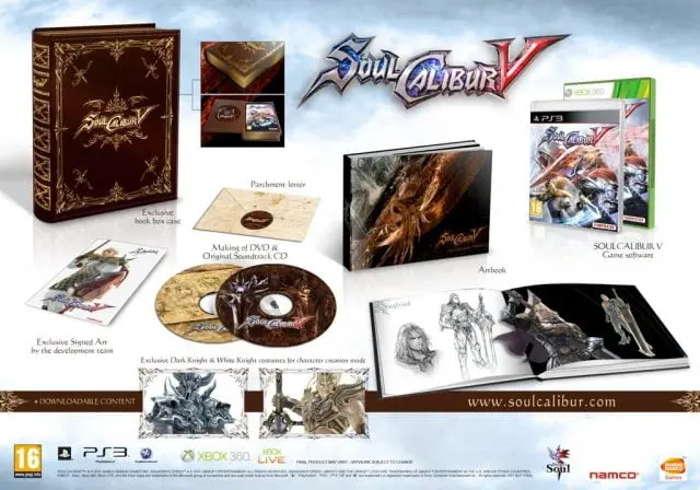 Alla storspel (och en del lite mindre) ska ha en samlarutgåva idag, så även kommande slagsmålsliret Soulcalibur V. Samlarutgåvan, som ser ut som en bok, innehåller förutom spelet till PS3 eller Xbox 360, en artbook, soundtracket på CD, en making of-DVD, DLC för Black Knight samt Paladin-rusntningarna, samt ytterligare artwork och ett av Project Soul signerat (konstgjort) pergament. Dessutom får man karaktären Dampierre spelbar från dag ett, något som annars är för förhandsbokarna. Den 3 februari kan du betala extra för allt det här.