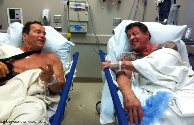 Det sägs att man inte kan lära gamla hundar sitta, och därför påstår jag att man heller inte kan lära gamla skådisar hålla sig borta från linsen. Och tacka fan för det. Arnold Schwarzenegger som är tillbaka i gammal fin form (typ) bjuder på den här ursköna bilden där både han och Sylvester Stallone väntar på fysiska korrigeringar efter de påfrestande inspelningarna av The Last Stand och The Expendables 2.