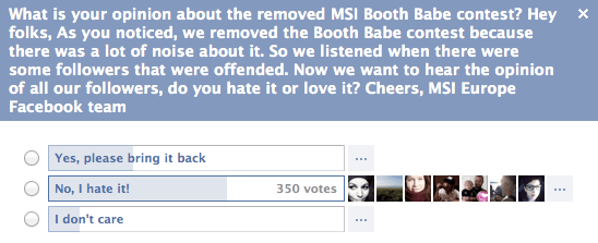 MSI would like to express our sincere apologies for introducing the booth babe contest published on our gaming website and on European Facebook page. While it was not our intention to disrespect any gender we see in retro perspective that we could not have been more wrong and therefore made decision to remove all related material and stop the contest with immediate effect. Once again we offer our apologies to those who have been offended.
