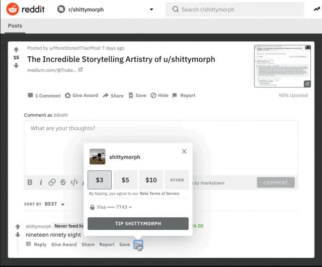 Reddit bestämde sig nämligen att just nu kan man bara ge dricks till en användare – u/shittymorph. Anledningen till det är att hen har lämnat bra kommentarer på sidan och ansvariga bakom sidan tyckte att shittymorph var en bra kandidat för att få pengar.